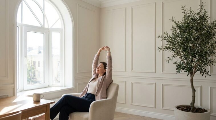 Inutile d’enfiler une tenue de sport ou de maîtriser une gymnastique complexe pour faire du bien à son corps. L’idée est d’apporter de la mobilité sans pression, avec des mouvements doux, tout à fait réalisables dans une tenue de travail classique. L’écoute de soi passe avant toute notion de performance. Voici une routine simple et bienveillante pour rentabiliser ces cinq minutes :
