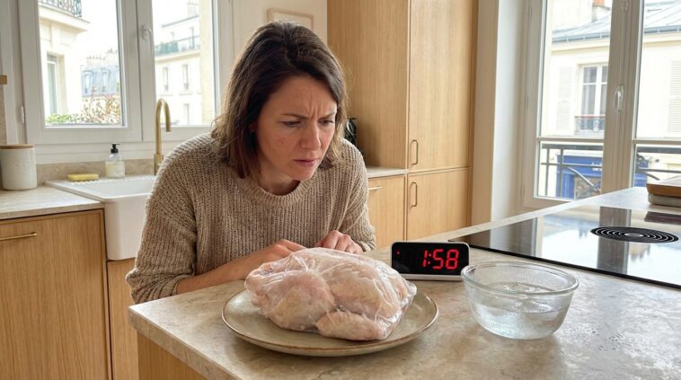 Vous rentrez du travail, le ventre affamé avec une folle envie de vous détendre en ce début de printemps, et vous réalisez l’impensable : votre repas du soir, ou l’ingrédient principal de votre dîner, est encore figé dans la glace au fond du congélateur. Face à ce contretemps, le premier réflexe est bien souvent de sortir l’aliment et de le déposer directement sur le comptoir de la cuisine pour grappiller un temps précieux. On se dit qu’en le laissant à l’air libre, la douceur ambiante fera son œuvre rapidement. Mais que se passe-t-il vraiment à la surface de ce produit qui tiédit doucement pendant que son cœur reste totalement gelé ? Sans le savoir, cette habitude en apparence inoffensive déclenche une véritable réaction en chaîne microscopique. Il existe en réalité une fenêtre de deux heures à peine avant que cette pratique ne se retourne contre votre santé. Voici pourquoi ce geste quotidien mérite d’être banni de nos cuisines et comment s’organiser pour retrouver le plaisir de cuisiner sans le moindre risque.