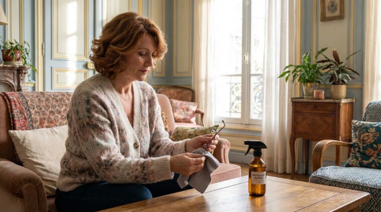 Il existe une alternative très simple, compatible avec les traitements, et qui évite l’effet “décapant” : un spray maison à base d’eau distillée et d’alcool isopropylique à 70°, avec une toute petite touche de liquide vaisselle. L’idée n’est pas de parfumer ni de faire mousser, mais de dissoudre les traces grasses sans attaquer les couches antireflet. La formule est aussi pratique pour celles et ceux qui veulent réduire les déchets, car un petit flacon se recharge facilement et évite d’empiler des lingettes jetables dans un tiroir de salle de bain.