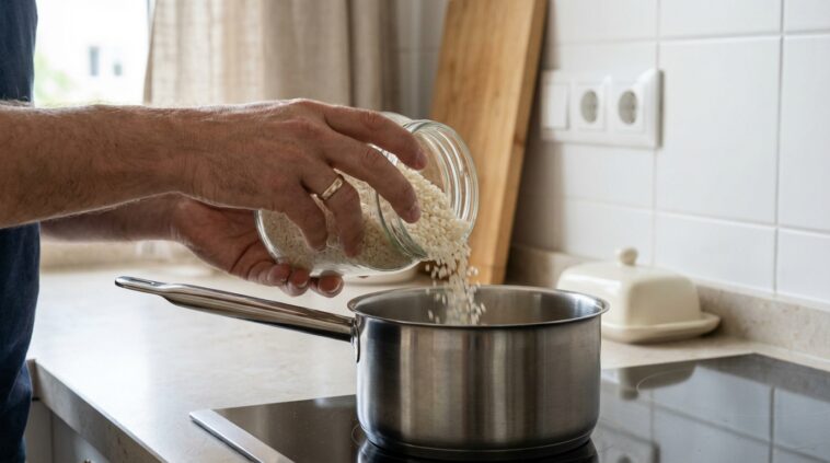 La vapeur s’échappe de la casserole, la minuterie sonne, et c’est malheureusement bien souvent la même amère déception au moment fatidique de soulever le couvercle : au fond du récipient trône une masse compacte, pâteuse et désespérément agglutinée. Ce désastre collant a ruiné une quantité incalculable de dîners, poussant les amateurs de cuisine à chercher inlassablement quelle pouvait bien être l’erreur fatale habilement cachée dans une routine culinaire en apparence inoffensive. Il est grand temps de lever le voile sur un automatisme qui sabote silencieusement les repas. La quête du grain parfait, léger et détachable ne relève pas de la magie, mais simplement de l’abandon d’un vieux réflexe que l’on pensait intouchable.## Ce drame perpétuel qui se jouait chaque soir dans la cuisine### Des dîners systématiquement gâchés par une bouillie informeRien n’est plus frustrant que de consacrer du temps et une belle énergie à mitonner un plat en sauce savoureux, pour finalement le servir accompagné d’une matière dense et informe qui étouffe les palais. Cette bouillie farineuse, loin d’apporter de la légèreté au repas, se transforme en un véritable plâtre au fond de l’assiette. Le gâchis est alors double : on gaspille de la nourriture par manque d’appétit pour cette texture peu engageante, et l’on perd totalement de vue le respect du produit brut, un principe pourtant fondamental pour quiconque souhaite adopter une démarche culinaire plus responsable au quotidien.### Le grand mystère d’une cuisson pourtant chronométrée à la seconde prèsL’incompréhension atteint souvent son paroxysme face à ce désastre récurrent. Les paquets promettent des temps d’ébullition précis, les minuteurs sont réglés avec l’exactitude d’une horloge suisse, et les volumes de liquide semblent respectés à la lettre. On s’applique à suivre méticuleusement les instructions imprimées sur l’emballage, espérant enfin obtenir ce fameux résultat égrené digne des meilleures tables. Pourtant, malgré cette rigueur quasi scientifique lors de l’ébullition, le résultat reste désespérément en deçà des attentes, prouvant que le problème ne se situe absolument pas dans la gestion du temps, mais bien en amont du processus.## Le mythe tenace de la préparation parfaite transmis depuis la nuit des temps### Ce réflexe purificateur sous le robinet que l’on croit indispensableGénération après génération, une étape spécifique s’est imposée comme un véritable dogme incontournable dans nos pratiques ménagères : le fameux passage sous l’eau froide pour nettoyer et débarrasser les grains de leurs impuretés. Ne pas rincer le riz avant cuisson relèverait presque du sacrilège dans de nombreuses cultures gastronomiques. Ce lavage abondant, répété jusqu’à ce que l’eau devienne parfaitement claire, est perçu comme l’ultime secret pour ôter l’excès d’amidon et garantir la séparation des grains. Une habitude qui, au passage, engloutit des litres d’eau potable de manière tout à fait superflue.### Une étape devenue obsolète pour la majorité des paquets de nos supermarchésSi ce nettoyage rigoureux avait tout son sens autrefois, ou lorsqu’on achète des variétés en vrac très poussiéreuses sur certains marchés, il a perdu sa pertinence. Nos filières d’approvisionnement modernes intègrent des processus de nettoyage mécanique et de brossage extrêmement poussés. En clair, les paquets classiques qui remplissent les étagères de la plupart de nos supermarchés renferment aujourd’hui une matière première d’une grande propreté. S’acharner à passer ces grains sous le jet d’eau relève désormais de l’automatisme obsolète, un geste qui, au lieu de bonifier la préparation, va précipiter sa perte.## L’explication scientifique qui se cache derrière ce désastre aqueux### L’absorption prématurée d’humidité qui sabote totalement les proportionsDès l’instant où le jet d’eau s’abat dans la passoire, un processus invisible et fatal s’enclenche. La matière sèche agit comme une éponge prodigieuse, se gorgeant d’humidité avant même de rencontrer la moindre source de chaleur. Cette absorption prématurée vient détruire intégralement toute tentative de respecter les ratios d’hydratation. Lorsqu’on ajoute ensuite le volume d’eau requis dans la marmite, on crée sans le savoir une surcharge liquide catastrophique. Le dosage mathématique vole en éclats, condamnant irrémédiablement le mélange à la noyade.### La fragilisation du grain d’amidon avant même la première bulle d’ébullitionOutre ce déséquilibre mathématique complexe, le nettoyage aqueux enclenche un phénomène structurel délétère. Sous l’effet prolongé de l’eau froide puis de l’égouttage complexe, l’enveloppe extérieure, très riche en amidon, commence à se déliter et à se ramollir. Le grain perd sa résistance naturelle et se fragilise de manière irréversible bien avant que la première bulle de chaleur ne vienne frémir sur le feu. Ce dommage anticipé transforme la structure solide en une matière collante prête à s’amalgamer dès que la température montera de quelques degrés.## La nouvelle méthode minimaliste du paquet directement aux fourneaux### Le saut audacieux dans la casserole sans passer par la case évierLa véritable révolution réside dans un acte de bravoure culinaire d’une simplicité enfantine : ouvrir le sachet et verser son contenu sec directement dans la marmite, en ignorant royalement la proximité de l’évier. Cette approche directe, presque transgressive pour les habitués du rinçage, permet de préserver l’intégrité absolue de notre ingrédient star. En supprimant définitivement ce passage sous l’eau, on pose enfin les bases saines d’une préparation infaillible. Fini le gaspillage d’eau courante et fini le doute face à la 