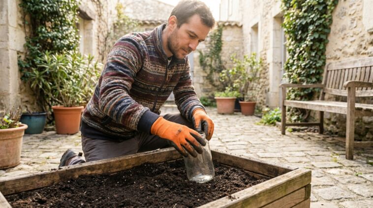 Passer à la mise en terre réclame une infime dose de douceur, car bousculer sauvagement les radicelles des occupantes relèverait du sacrilège. Munissez-vous d’une petite truelle de repiquage et aménagez un creux cylindrique dans un coin de la jardinière, à très courte distance du tronc ou des tiges centrales. Glissez-y délicatement le bocal la tête en bas. La fibre saturée entre alors en contact intime avec l’univers souterrain, déclenchant l’échange capillaire de manière instantanée.